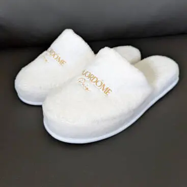 Custom made, with ultra soft and non-slip thick foam sole, custom sizing, soft velvet outer fabric, suitable for indoor use or as premium goodies.